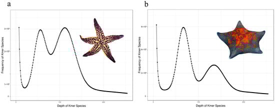 Sequencing of the libraries for A. amurensis and P. pectinifera generated 79.91 Gb and 93.57 Gb of raw data, respectively. Filtered whole-genome sequencing data metrics for both species are shown in Table 1. Clean reads were screened against the NT database for DNA contamination. The alignment results showed that 99.88% of the reads matched DNA from closely related species of A. amurensis, and 94.86% matched DNA from closely related species of P. pectinifera (Table S2), indicating no significant foreign DNA contamination. The 17-Kmer frequency plot (Figure 1) shows prominent heterozygous peaks in both A. amurensis and P. pectinifera, confirming their diploid genomes (Figure 2). Genomic metrics are as follows: A. amurensis has a 477 Mb genome with 1.52% heterozygosity and 53.60% repetitive sequences, while P. pectinifera has a 529 Mb genome with 2.90% heterozygosity and 56.02% repetitive sequences (Table 2). High-quality filtered sequences were used for draft genome assembly: A. amurensis achieved contig N50 of 79 bp and scaffold N50 of 1823 bp, whereas P. pectinifera had contig N50 of 86 bp and scaffold N50 of 1328 bp (Table 3).