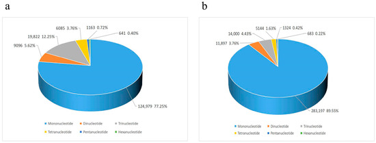 Frequency distribution of identified microsatellite motifs in A. amurensis (a) and P. pectinifera (b) SSRs, showing distinct proportions of di- to hexanucleotide repeats.