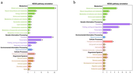 Using the assembled draft genomes in this study, 171 single-copy orthologous genes were identified in A. amurensis, with 94 in P. pectinifera. The GO annotation results indicated that for A. amurensis (Figure 5a, Table S3), the main terms related to single-copy orthologous genes included cytoskeleton dynamics, energy metabolism and enzyme activity, nervous system development and regulation, gene expression regulation, and ribosome biogenesis and assembly. In P. pectinifera (Figure 5b, Table S4), the main terms related to single-copy orthologous genes included protein kinases and signal transduction, nervous system development and regulation, ribosome biogenesis and translation regulation, metabolism and enzyme activity, and cell signal transduction and immune response. KEGG annotation showed that single-copy orthologous genes in A. amurensis were mainly related to processes such as glycan biosynthesis and metabolism, energy metabolism, translation, transcription, transport, and catabolism (Figure 6a). In P. pectinifera, single-copy genes were primarily involved in glycan biosynthesis/metabolism, translation, folding/sorting/degradation, transport, and catabolism (Figure 6b). During environmental adaptation, both species sense external changes via signal transduction pathways.