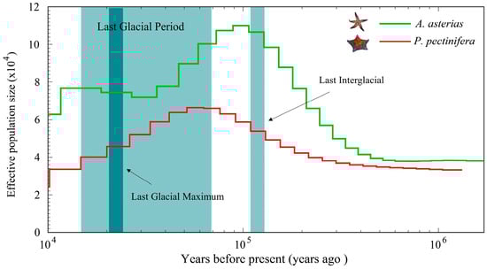 Population historical dynamics research is a crucial dimension for analyzing species’ adaptive evolution and phylogenetic relationships. Using the PSMC model, this study inferred changes in the effective population size (Ne) of A. amurensis and P. pectinifera during the Pleistocene glaciation, with the results echoing and supplementing paleoclimatic records and previous studies. For example, the Ne peaks of the two species during the Last Interglacial Period (approximately 105 years ago) highly coincide with the Northern Hemisphere interglacial warming event [48], confirming that climate-driven fluctuations in marine productivity promoted the population expansion of benthic organisms [49]. Notably, the divergent recovery patterns after the Last Glacial Maximum—A. amurensis showing no further reduction in Ne, with P. pectinifera maintaining persistently low Ne—may reflect differences in their ecological strategies. As a eurythermal invasive species, the former likely rapidly adapt to new habitats through phenotypic plasticity (e.g., adjustments in feeding behavior), whereas the latter’s recovery is delayed due to its sessile lifestyle and narrow salinity tolerance. By comparing the changes in the effective population sizes of the two species, it is possible to explore the divergence time in their evolutionary history and the existence of a common ancestor. This information is of great significance for understanding the phylogenetic relationships within the class Asteroidea.