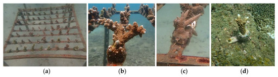 The coral transplantation: (a) a grid nursery; (b) A. robusta; (c) A. valenciennesi; (d) individual plug.