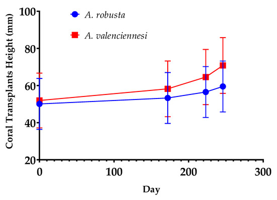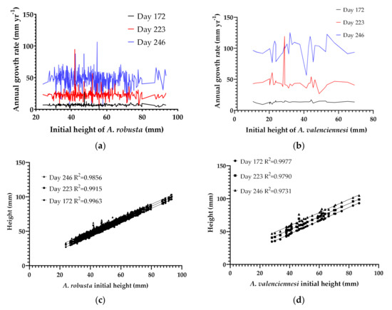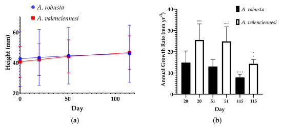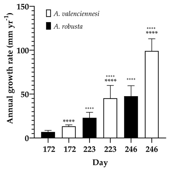 Both species displayed increasing annual growth rate over time, with A. valenciennesi significantly outgrowing A. robusta across all time points. Overall, A. robusta’s annual growth rates were 6.838 ± 1.772, 22.93 ± 6.286 and 47.60 ± 11.88 mm yr−1 at day 176, 223 and 246, respectively, while A. valenciennesi registered annual growth rates of 13.30 ± 1.611, 45.26 ± 14.56 and 99.19 ± 13.73 mm yr−1 at the corresponding days (Figure 4).
