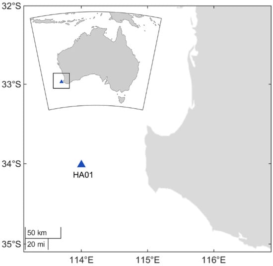 Passive acoustic data were collected from the Comprehensive Nuclear-Test-Ban Treaty Organization (CTBTO) acoustic monitoring station (HA01) southwest of Cape Leeuwin, Western Australia (Figure 1). CTBTO has installed low-frequency hydrophones (sampling frequency: 250 Hz) in the SOFAR channel in every ocean to conduct long-range acoustic monitoring []. The hydrophones are cabled to shore and offer a continuous recording capability, making them suitable not just for their intended purpose of detecting nuclear explosions, but also for civil and scientific purposes such as the environmental monitoring of ice and ocean temperature [] and the detection of whales [,]. Continuous recordings from Cape Leeuwin were obtained for the period of 1 January 2002–31 December 2020. For data analysis, recordings were split into 1 h samples.