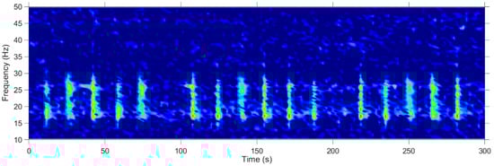 Passive acoustic monitoring (PAM) has enabled the extensive identification of the species’ distribution and migration patterns around the world—based on its stereotypical vocalizations [,,,,]. The most widely identified call type of the fin whale, referred to as the 20 Hz pulse, is ideal for PAM, as the pulses are strong (source levels up to 190 dB re 1 µPa m) and of low frequency (18–42 Hz) [,,,,,]—ideal for long-range propagation. The pulses are short (~1 s) and produced in highly stereotyped rhythmic sequences with inter-pulse intervals (IPs) of 7–26 s. These repetitive sequences (songs) are believed to only be produced by males as a breeding display, while single, irregular 20 Hz pulses may be produced by all demographic cohorts in association with social behaviors [,].