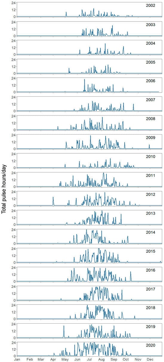 Line graphs of the total number of hours per day with fin whale 20 Hz acoustic presence (pulse-hours per day) across all years.