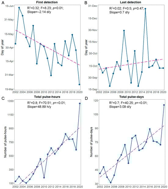 Scatterplots of fin whale (A) first detection, (B) last detection, (C) total pulse-hours per year, and (D) total pulse-days per year at Cape Leeuwin between 2002 and 2020. Regression statistics (R2, F, p-value, and slope) are noted within each plot.