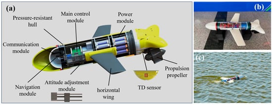 Schematic diagram of (a) high-maneuvering underwater glider, (b) prototype of Seaswan-I Glider, and (c) lake test of underwater glider.