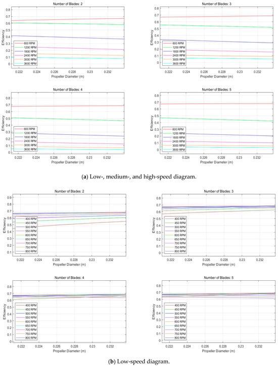 Figure 3 illustrates the interdependence between η-RPM. In Figure 3a, the speed relationship is illustrated according to line color. Although we obtain the data as the number of features in the region, we can still observe the corresponding relationship using the data. It is not difficult to see that the efficiency is the highest at about 600 rpm. Under the condition that the blade is unchanged, the efficiency decreases with the increase in the rotational speed. We conclude that NACA 6 series blades may achieve better efficiency at low speeds. The NACA 6 series blades show that the hydrodynamic performance is not ideal at high and medium speeds. We conclude that the NACA 6 series blades may achieve better efficiency at low speeds. We then perform a low-speed analysis of the obtained NACA 65A010 blade to obtain the optimal speed threshold. In the low-speed operation, as shown in Figure 3b, the hydrodynamic efficiency reaches a peak within the defined geometric boundary. This optimization of operating parameters provides key guidance for marine propulsion systems and balances energy conservation and dynamic response capabilities. In the figures, different colors represent different speeds of blade rotation and each color corresponds to the speed relationship.