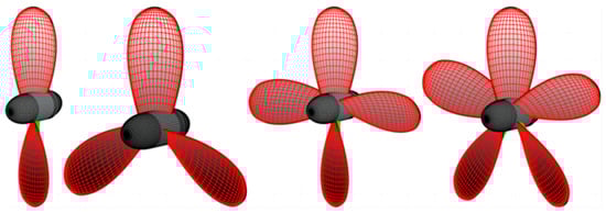 where represents material permissible stress (Pa), PD the shaft power (W), and N rotational velocity (rpm). Rigorous investigations [,,,] confirm that invariant power and rotational speed impose an inverse proportionality between propeller diameter and pitch magnitude. Although variations in radial pitch distribution exert negligible influence on open-hydrodynamic efficiency, they profoundly modulate cavitation susceptibility.