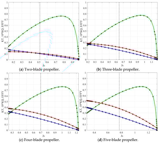 Based on the numerical prediction of OpenProp, the hydrodynamic efficiency curve of the blade is shown in Figure 5. In Figure 5, the hydrodynamic performance curves of NACA 65A010 series two-blade, three-blade, four-blade and five-blade propellers are presented. The horizontal axis advance coefficient Js reflects the working condition through the correlation of advance speed to rotation speed and propeller diameter. The vertical axis covers green hydrodynamic efficiency η, blue thrust coefficient KT and red torque coefficient KQ. Increasing rotational inertia demonstrates an inverse correlation with both torque and thrust coefficients, which exhibit gradual decline. The hydrodynamic efficiency shows a nonlinear dependence on the rotational inertia, which gradually decreases after the initial increase. The five-blade propeller of the NACA 65A010 blade reaches a peak efficiency of 69.01% under the same conditions, which is superior to other configurations.