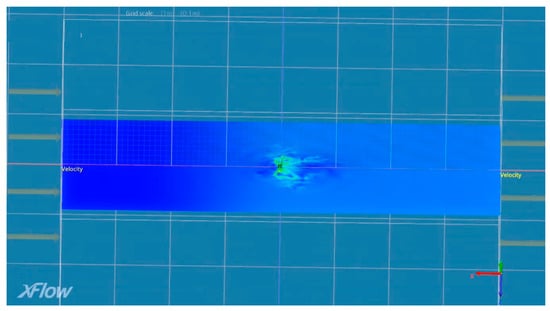 Because of its use of basic numerical methods, the complete Lagrangian methodology is a meshless computational fluid dynamics paradigm, obtained through the discrete Lagrangian reference frame using continuous tracer transport monitoring to analyze flow dynamics. Therefore, it is characterized by independent grids, requiring only the setting of the grid number, and 8,192,000 independent grids are set in the slice for simulation calculation, as shown in Figure 6. It shows the flow field distribution of the blade when it moves in the fluid. The cooler the color tone, the lower the flow velocity in the region, and the warmer the color tone, the higher the flow velocity in the region. According to the color, we can infer that the bright green area in the center of the blade exhibits special phenomena such as a pressure change or vortex.