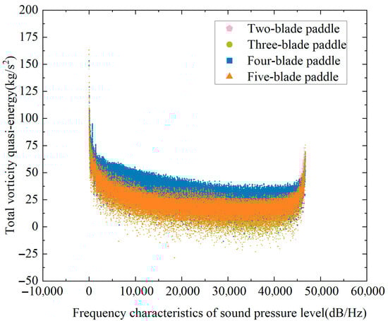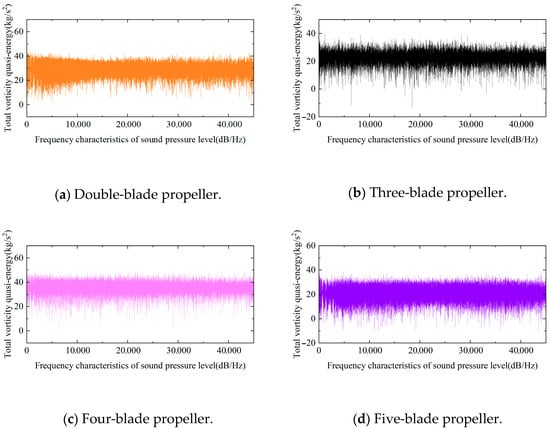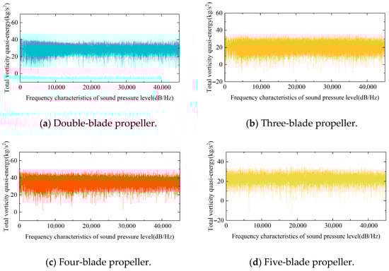 The simulated data was processed using fast Fourier transform (FFT) to generate the FFT diagram, as illustrated in Figure 7. It shows the corresponding relationship between sound pressure level and energy, and different colors represent different numbers of blades. It can be seen from the figure that the data results of each blade are concentrated and stably distributed, and there are fluctuations within a reasonable range. The results indicate that the noise produced by the propeller during operation exhibits both periodicity and persistence, with stable noise levels and no significant fluctuations. From the diagram, it can be seen that the five-blade propeller performs best at 500 rpm and generates the lowest noise compared with the best speed distribution of other blades.