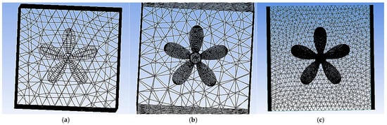Three meshing results for a five-blade propeller: (a) Mesh1; (b) Mesh2; (c) Mesh3.