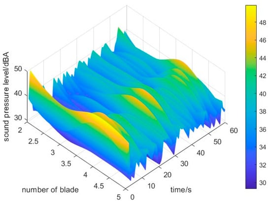 From the experimental results, it can be seen that from the time dimension, the sound pressure level fluctuates under different blade numbers in the whole time span of 60 s. However, on the whole, when the number of blades is small, the fluctuation range of sound pressure level is relatively small, and the value is low.