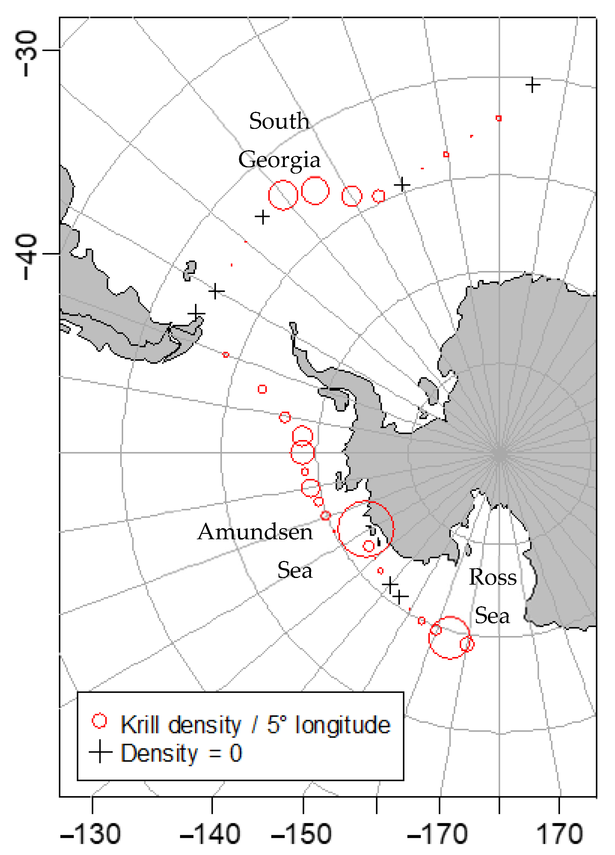 - Atkinson, A.; Siegel, V.; Pakhomov, E.A.; Rothery, P.; Loeb, V.; Ross, R.M.; Quetin, L.B.; Schmidt, K.; Fretwell, P.; Murphy, E.J.; et al. Oceanic circumpolar habitats of Antarctic krill. Mar. Ecol. Prog. Ser. 2008, 362, 1–23. [Google Scholar] [CrossRef]