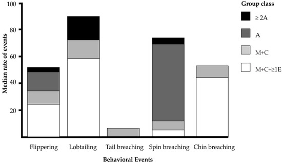 Median rate of the five behaviors by group class. A = groups of only one adult whale (n = 2), ≥2A = groups formed by two or more adult whales (n = 4), M+C = mother–calf pairs (n = 20) and M+C+≥1E = M+C pairs accompanied by one or more escorts (n = 13).