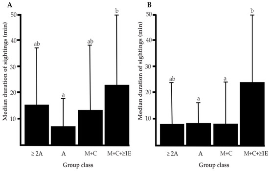 (A) Median (+q3) duration of encounters (n = 102) and (B) median of the number of vessels present (n = 104) by group class. Different letters above the error bars (a,b) indicate statistically significant differences in the median rate of a given behavior between group classes. Bars that share at least one letter (e.g., ‘ab’ and ‘a’) are not significantly different. Bars with different letters and no overlap (e.g., ‘a’ vs. ‘b’) differ significantly.
