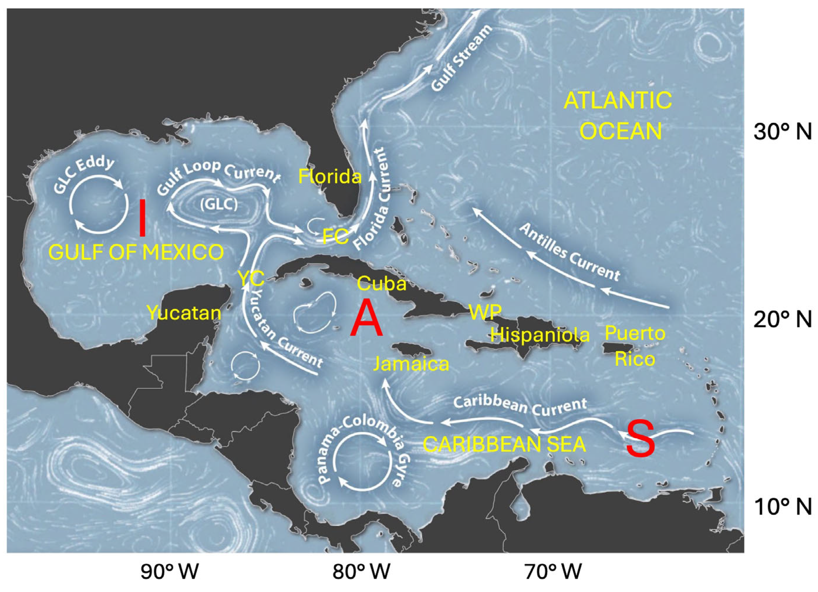 2]), form an anticyclonic loop throughout the IAS that includes the Caribbean Current, the Yucatan Current, the Loop Current, and the Florida Current. The latter feeds the Gulf Stream, a strong, warm current that influences the climate of the eastern coast of the United States and of northwest Europe.