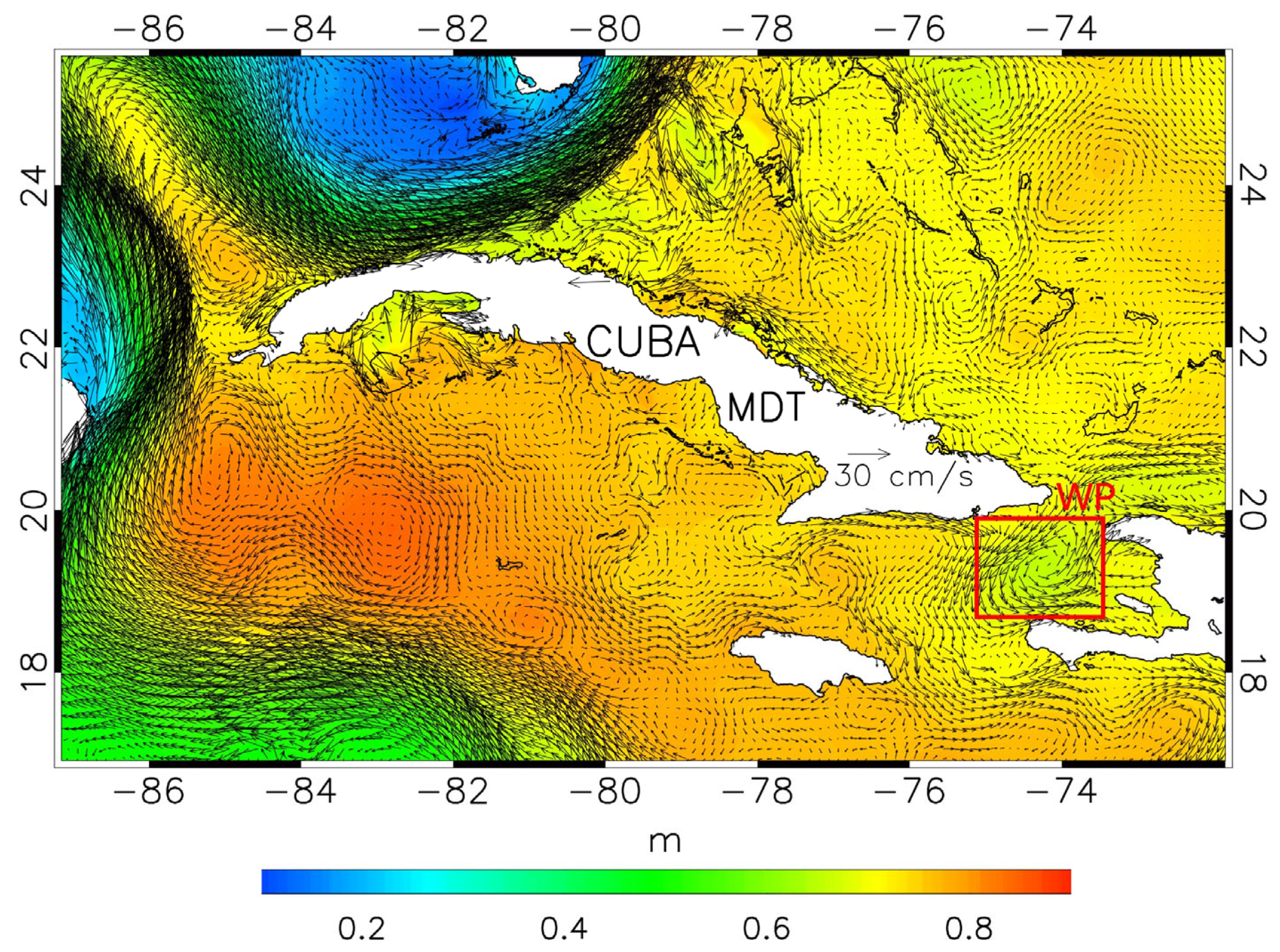 A map of the MDT in the area around Cuba, with the corresponding geostrophic velocity field superimposed, is displayed in