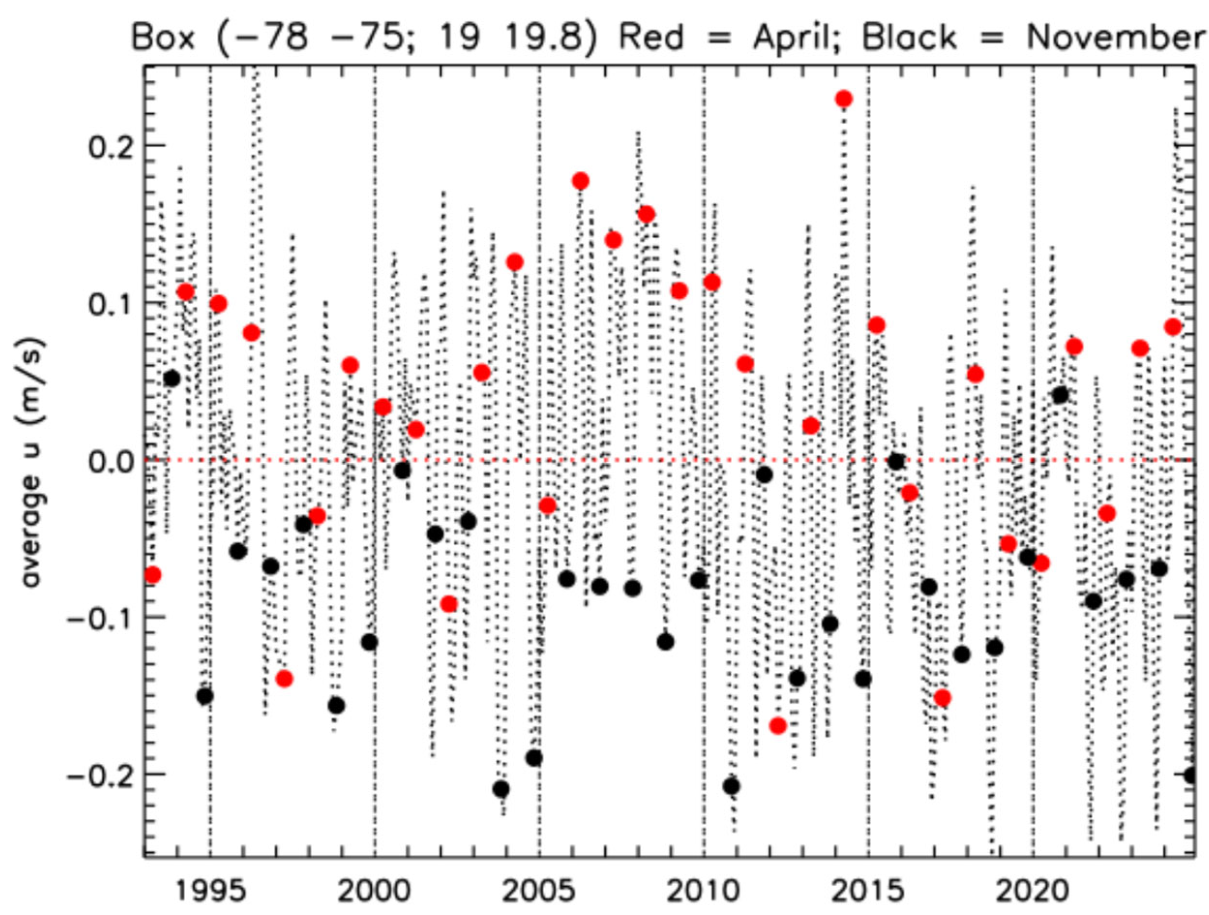 Figure 6, we have highlighted the April (red filled circles) and November (black filled circles) values throughout the whole period. They are well separated, with almost all the black circles lying on the negative u side (westward flow), and about two thirds of the red ones on the positive u side. This indicates the presence of a recurrent seasonal variation in the local dynamics, with significant inflow from the WP that only occurs during the autumn months. In fact, a sharp seasonal component is the dominant signal in the Fourier power spectrum of