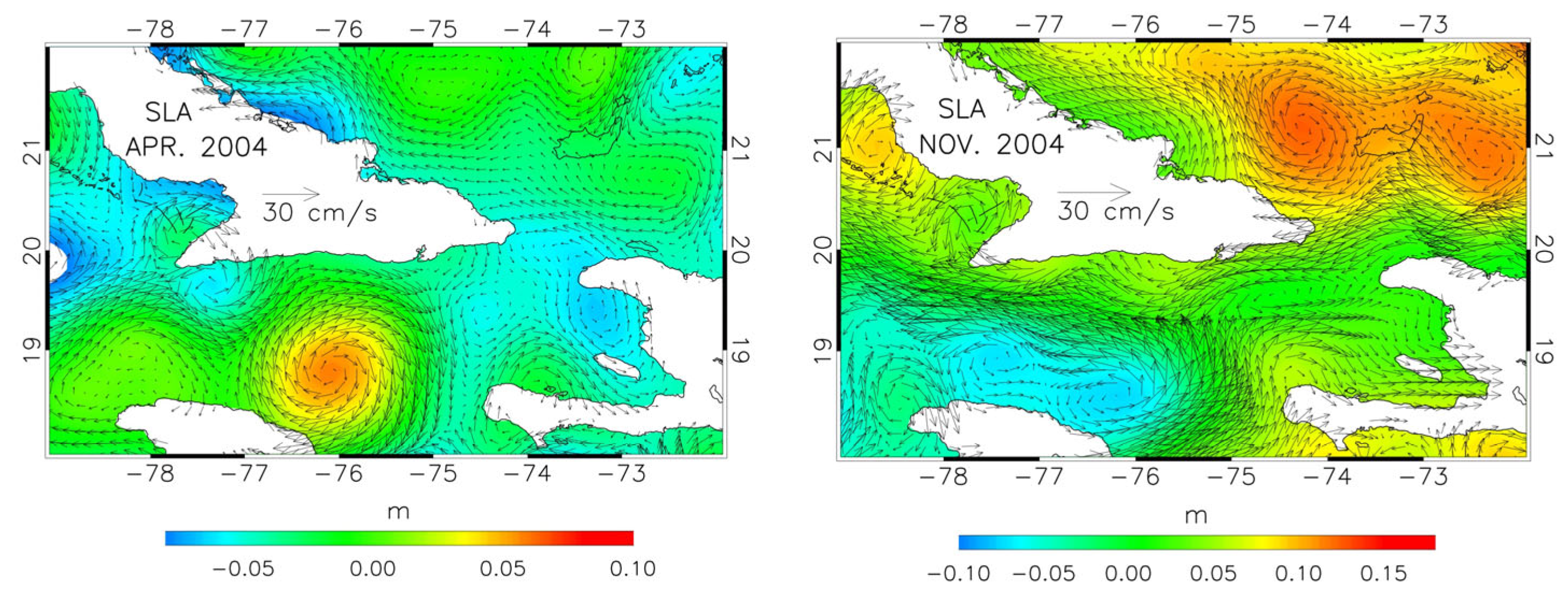 Figure 5 shows robust currents entering from the western side of the WP during the autumns of 2003 and of 2004, which progress westward, between Cuba and Jamaica. In these seasons, the cyclone to the south of the WP highlighted in the discussion of the MDT tends to be weaker and is sometimes absent. On the other hand, the maps of April and July 2004 show the presence of a “blocked” pattern, in which a wide cyclonic circulation is present just to the south of the passage, with an adjacent anticyclone to the west, and little flow appears to enter the Caribbean. This is in good qualitative agreement with the transport time series of
