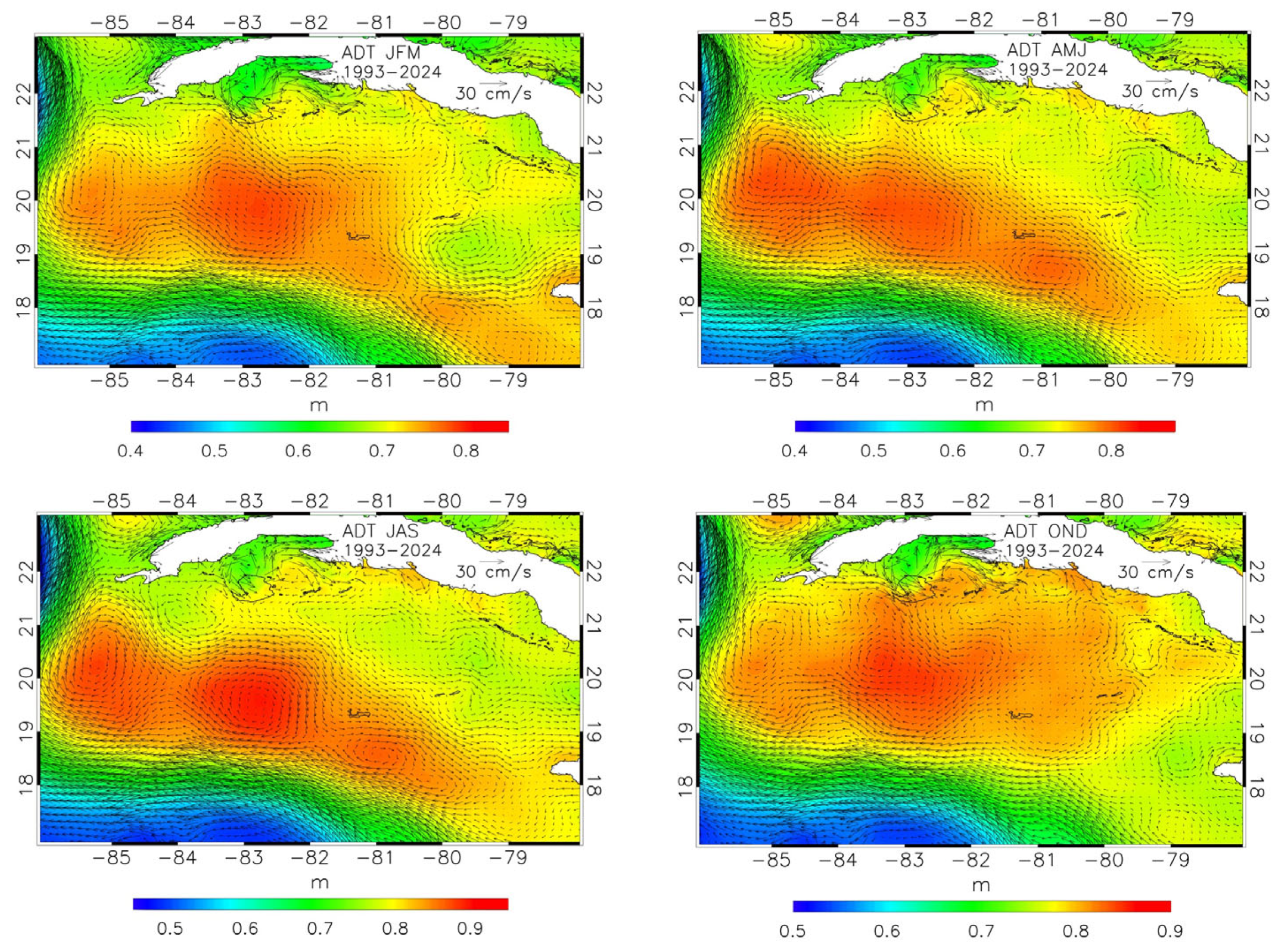 Figure 11 shows average (1993–2024) ADT maps for this region, for the different seasons, with the corresponding geostrophic circulations superimposed.