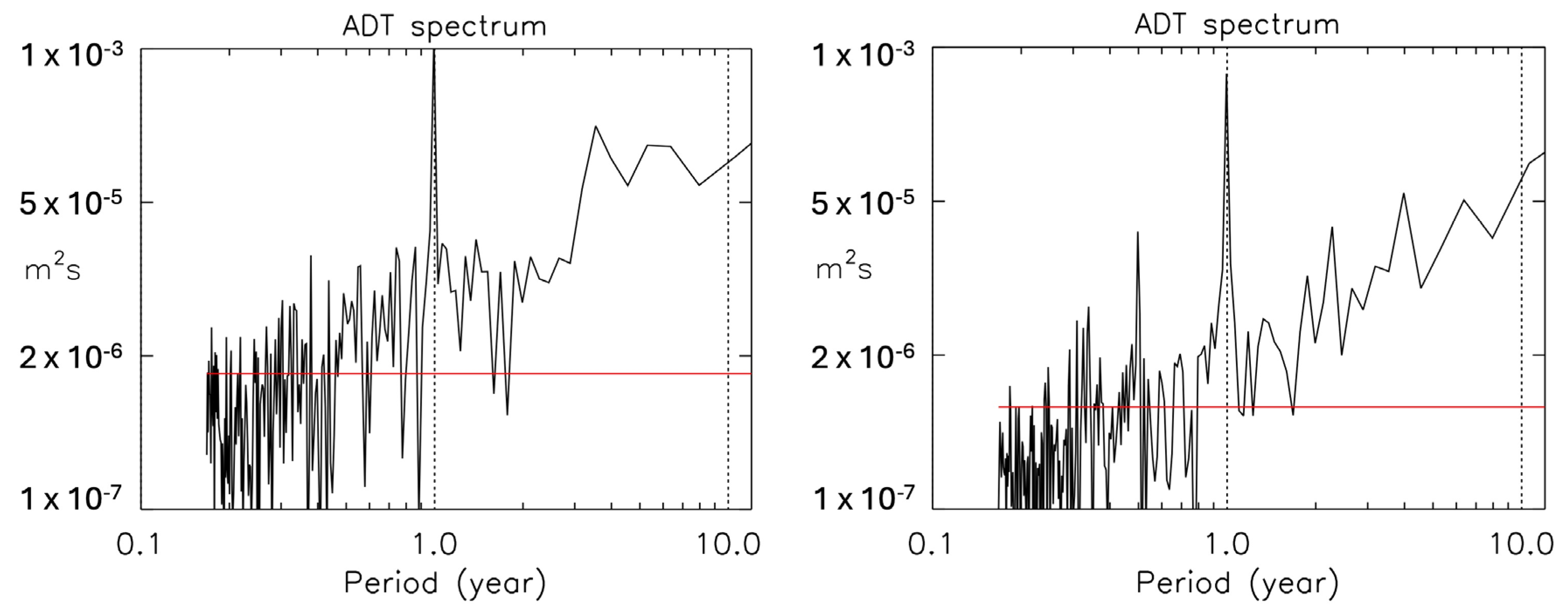 Figure 13. The panel on the right instead is for the ADT averaged over a large box more to the south that includes all the CS below 18° N (84°–61° W, 10°–18° N). The spectra resemble each other, with the seasonal signal standing out in both, but there are some differences. For example, there is a sharp 6-month period peak in the spectrum over the southern Caribbean that is not as clearly defined in the spectrum on the left. The interannual components are also somewhat different; the spectrum on the right contains a series of sharp peaks with periods of about 2, 4, and 6 years, typical of atmospheric variability, which are less well-defined in the spectrum relative to the southwestern Cuban waters.