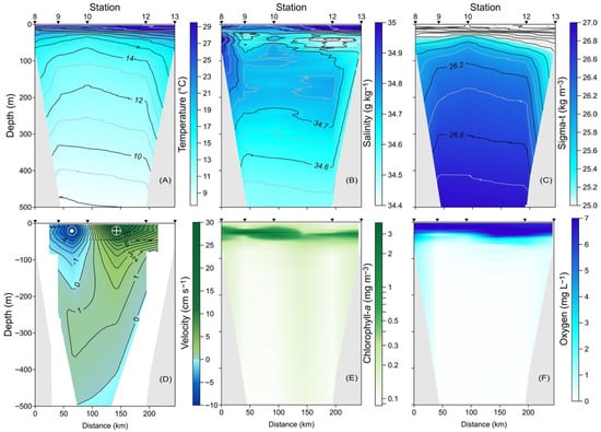 Vertical distribution along the B-B′ transect in the upper 500 m layer of (A) conservative temperature (°C), (B) absolute salinity (g kg−1), (C) density (sigma-t, kg m−3), (D) meridional component of the geostrophic velocity (cm s−1), (E) chlorophyll-a (mg m−3), and (F) dissolved oxygen (mg L−1).