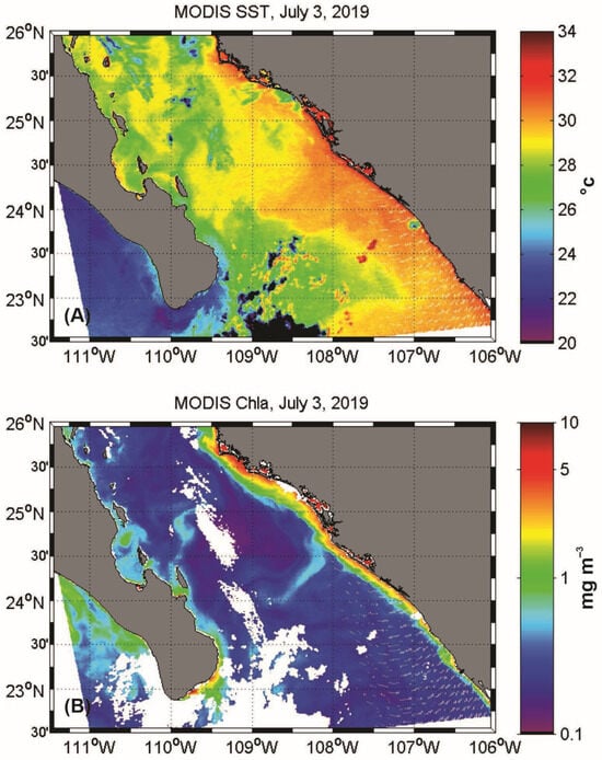 Additionally, satellite data on sea surface temperature and chlorophyll-a were collected from the Moderate Resolution Imaging Spectroradiometer (MODIS-AQUA, NASA, Washington, DC, USA) on 3 July 2017. This data was processed according to the protocols described in Durán-Campos et al. [], while maps of both variables were generated using MATLAB 2021b (MathWorks, Natick, MA, USA) routines.