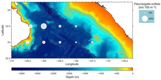 In the Gulf of California, a large interior sea located on the North American continent, in Mexico, the ecosystem is highly dynamic, influenced by various physical processes such as internal waves, upwelling events, eddies and fronts. It is known that chaetognaths are a significant numerical component of this ecosystem. In the 1960s, the first taxonomic lists of chaetognaths were published, identifying three species in coastal waters off Sinaloa [] and 13 species in oceanic waters []. Over time, the list increased to include 17 species. Among the most abundant species included Sagitta enflata Grassi, 1881 (now called as Flaccisagitta enflata (Grassi, 1881), Sagitta minima Grassi, 1881 (now called as Mesosagitta minima (Grassi, 1881), Sagitta euneritica Alvariño, 1961 (now called as Parasagitta euneritica (Alvariño, 1961) and Sagitta decipiens Fowler, 1905 (now called as Decipisagitta decipiens (Fowler, 1905). The horizontal distribution of these species varies seasonally, primarily influenced by changes in water temperature []. Research conducted a few years later confirmed the dominance of S. enflata in the Gulf’s interior, a species that can occasionally account for 100% of the chaetognath community in the region [].