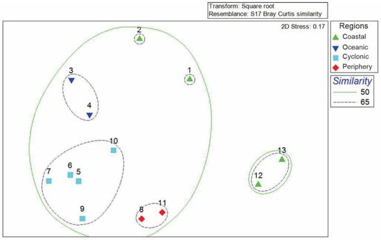 The NMDS analysis conducted in our study indicated a relatively low stress level of 0.17, suggesting that the data is adequately represented. We observed a clustering of sampling stations based on the composition and density of organisms, which allowed us to identify four distinct regions: (1) a coastal region, (2) an oceanic region, (3) a region associated with cyclonic circulation, and 4) a region located at the periphery of the cyclonic circulation (Figure 6). The analysis also revealed groupings based on the geographical positions of the stations. For instance, stations 1 and 2 located at A-A’ transect off mainland coast, station 1 presents higher species number, stations 12 and 13, located along the B-B′ transect, exhibited a high degree of similarity. Meanwhile, stations 5, 7, 6, 9, and 10 showed a strong relationship with the core of the cyclonic circulation, forming a subgroup with a similarity of 65%. In contrast, the stations situated near the cyclonic circulation, specifically stations 8 and 11, formed a separate subgroup, while the oceanic stations (stations 3 and 4) created another subgroup. The ANOSIM test confirmed the separation of these groups (p = 0.001).