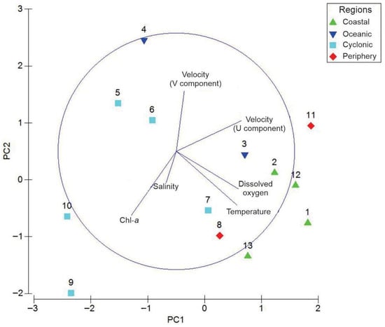 The PCA analysis revealed that Component 1 accounted for 38.4% of the environmental variability, while Component 2 explained 25.1%, resulting in a total of 63.5%. For the first component, the environmental variables with the highest influence included the zonal component of the geostrophic velocity (U), dissolved oxygen, and temperature. Conversely, the second component was primarily influenced by chlorophyll-a, meridional component of geostrophic velocity (V), and temperature (Table S2).
