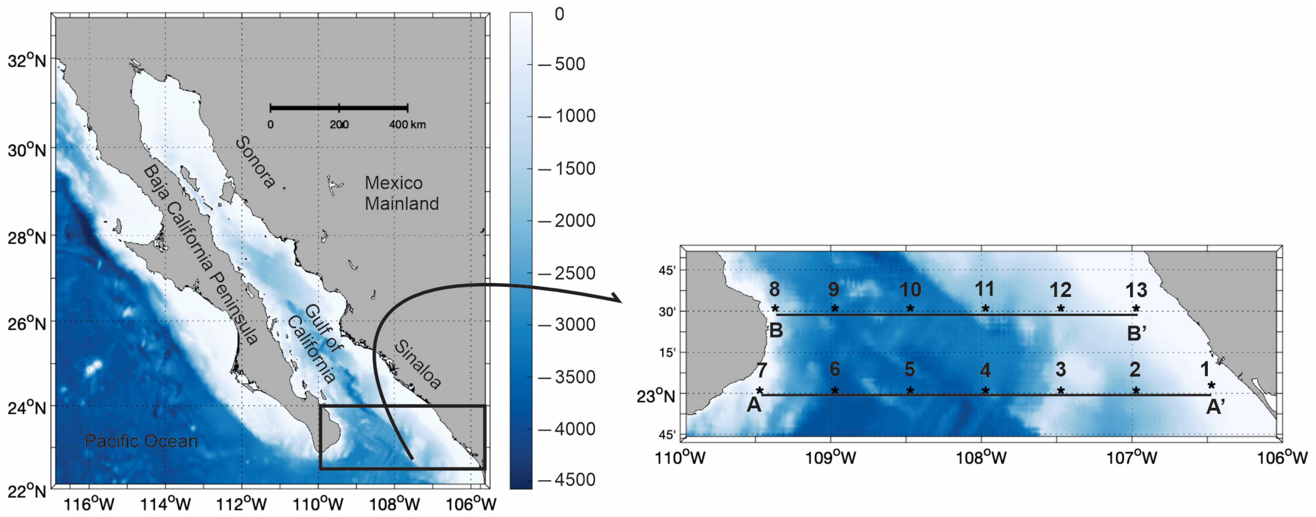 - Lavín, M.F.; Castro, R.; Beier, E.; Godínez, V.M.; Amador, A.; Guest, P. SST, thermohaline structure, and circulation in the southern Gulf of California in June 2004 during the North American Monsoon Experiment. J. Geophys. Res. 2009, 114, 1–22. [Google Scholar] [CrossRef]