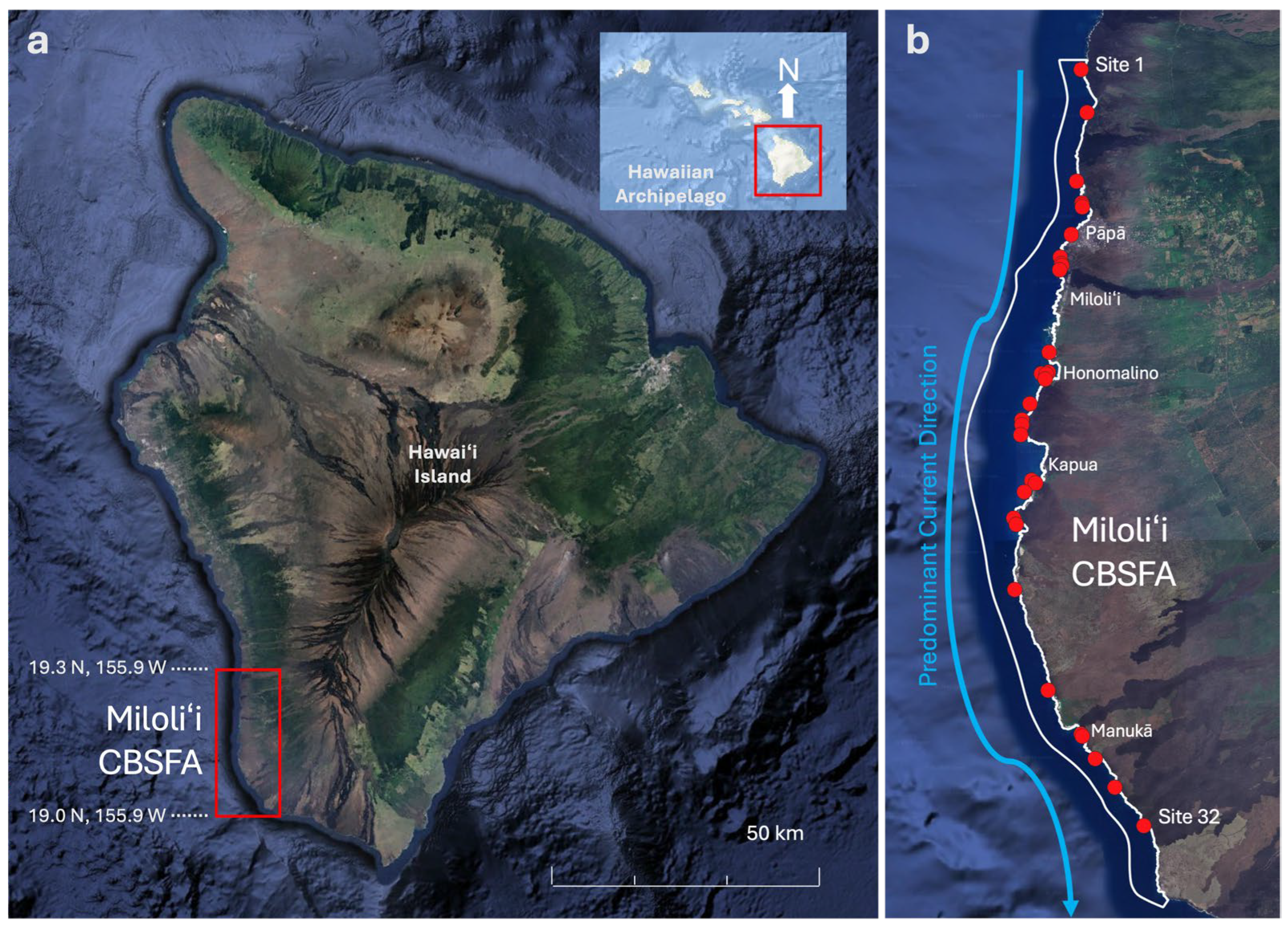- Fukunaga, A.; Asner, G.P.; Grady, B.W.; Vaughn, N.R. Fish Assemblage Structure, Diversity and Controls on Reefs of South Kona, Hawaiʻi Island. PLoS ONE 2023, 18, e0287790. [Google Scholar] [CrossRef] [PubMed]