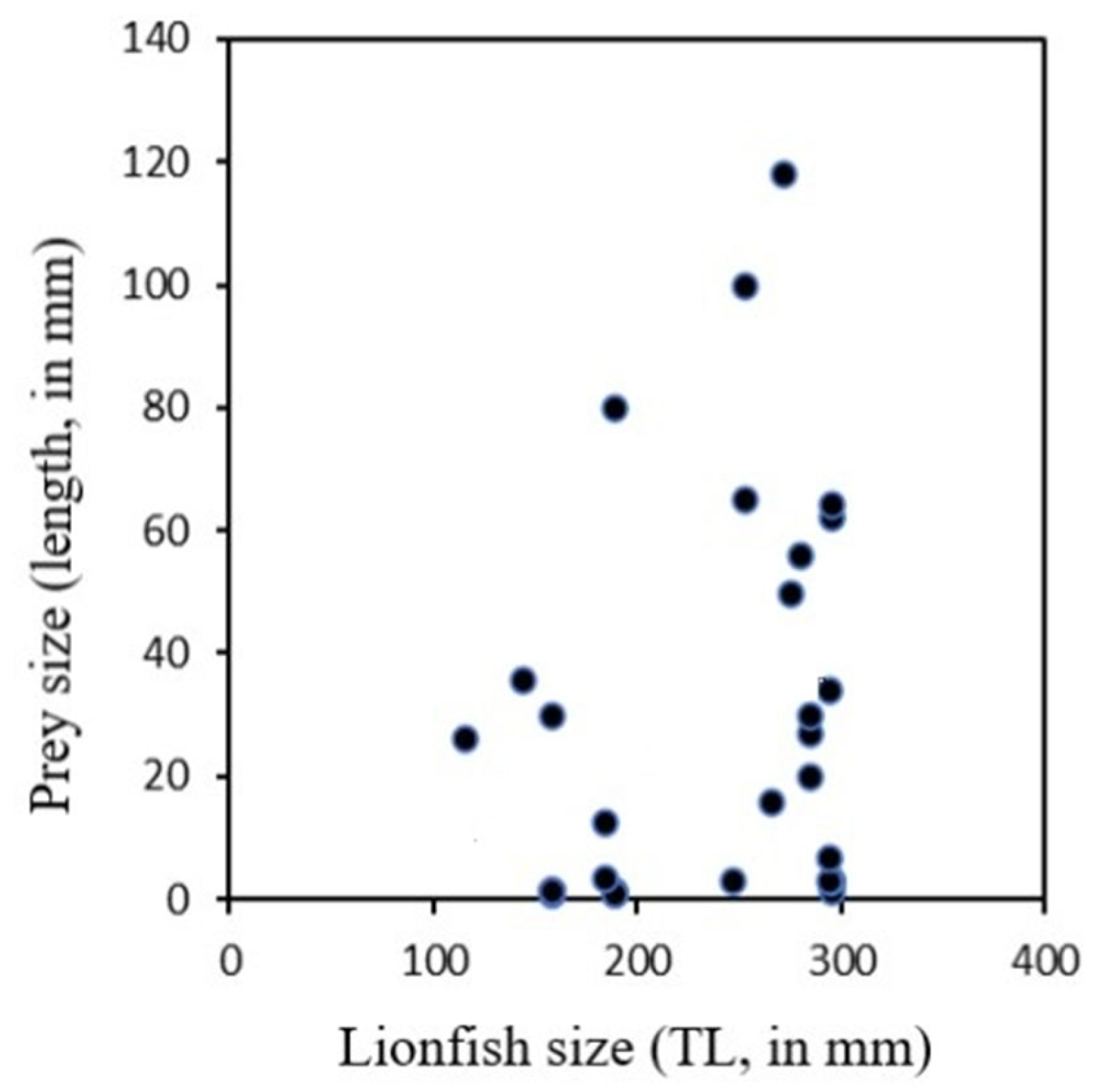 - Acero, P.A.; Bustos-Montes, D.; Pabón, P.; Polo-Silva, C.J.; Muñoz, A.S. Feeding Habits of Pterois volitans: A Real Threat to Caribbean Coral Reef Biodiversity. In Impacts of Invasive Species on Coastal Environments. Coastal Research Library; Makowski, C., Finkl, C., Eds.; Springer: Cham, Switzerland, 2019; Volume 29, pp. 269–314. [Google Scholar] [CrossRef]