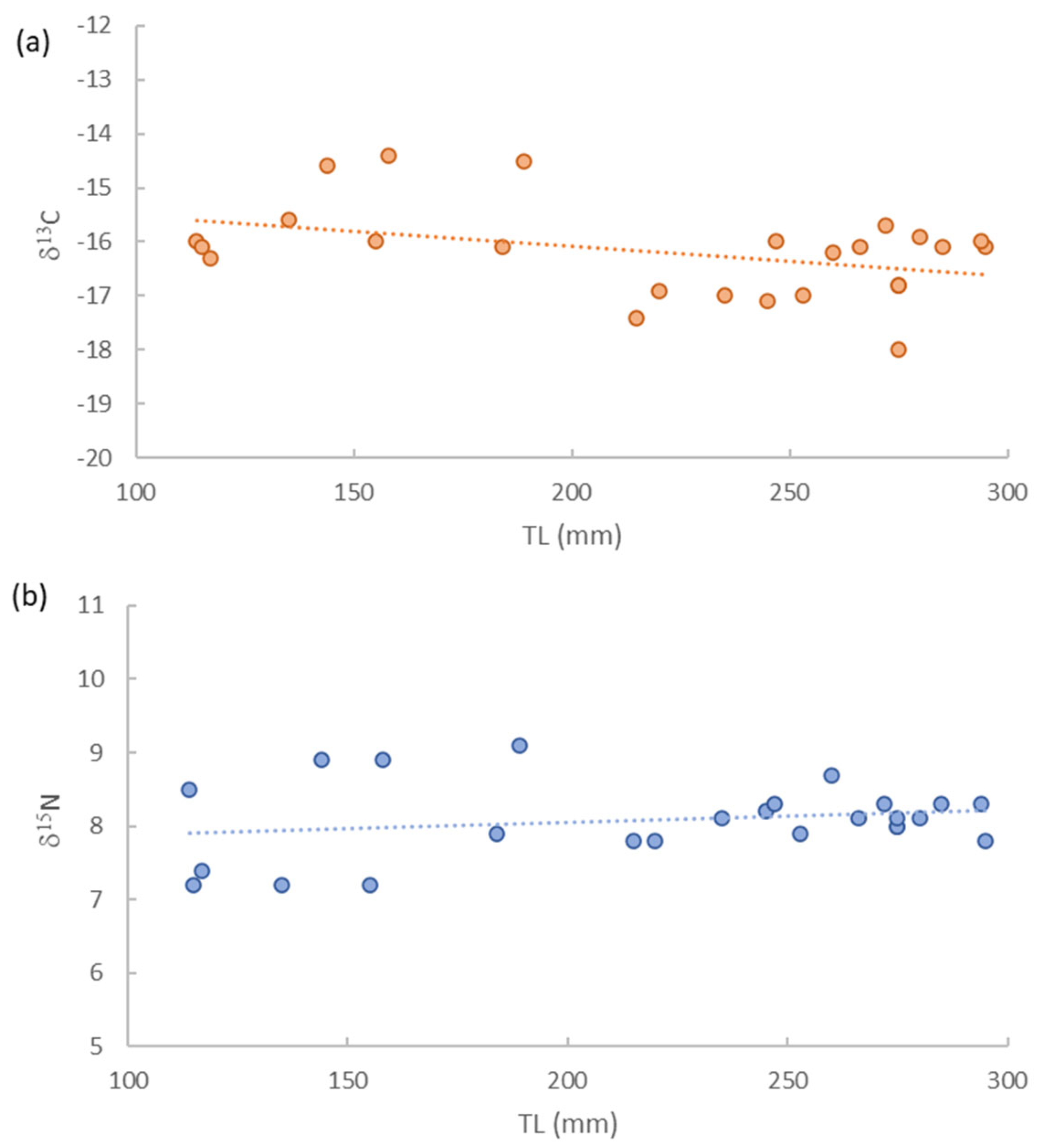 - Trueman, C.N.; MacKenzie, K.M.; Palmer, M.R. Identifying migrations in marine fishes through stable-isotope analysis. J. Fish Biol. 2012, 81, 826–847. [Google Scholar] [CrossRef] [PubMed]
