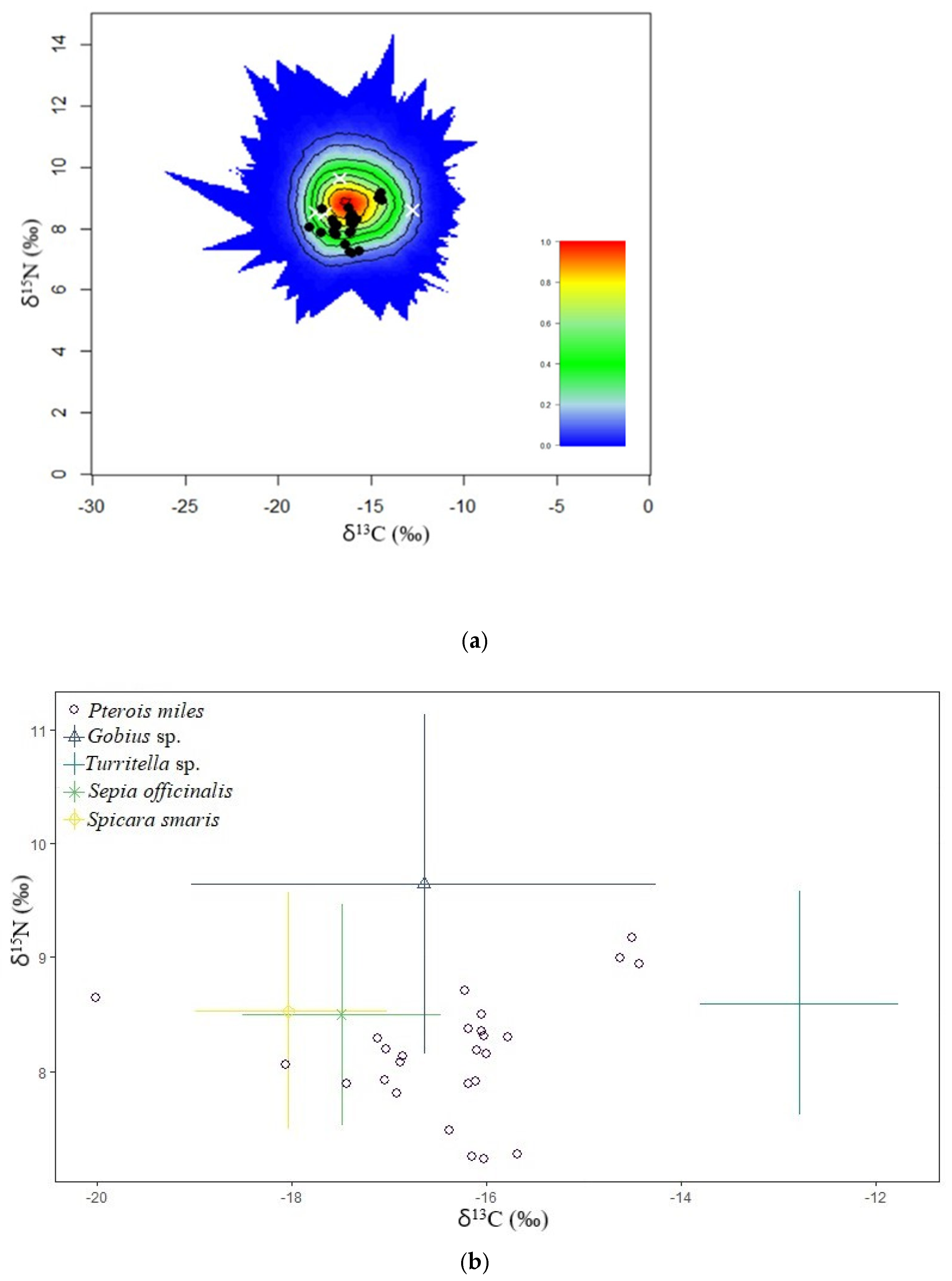 - Quezada-Romegialli, C.; Jackson, A.L.; Hayden, B.; Kahilainen, K.K.; Lopes, C.; Harrod, C. tRophicPosition, an r package for the Bayesian estimation of trophic position from consumer stable isotope ratios. Methods Ecol. Evol. 2018, 9, 1592–1599. [Google Scholar] [CrossRef]