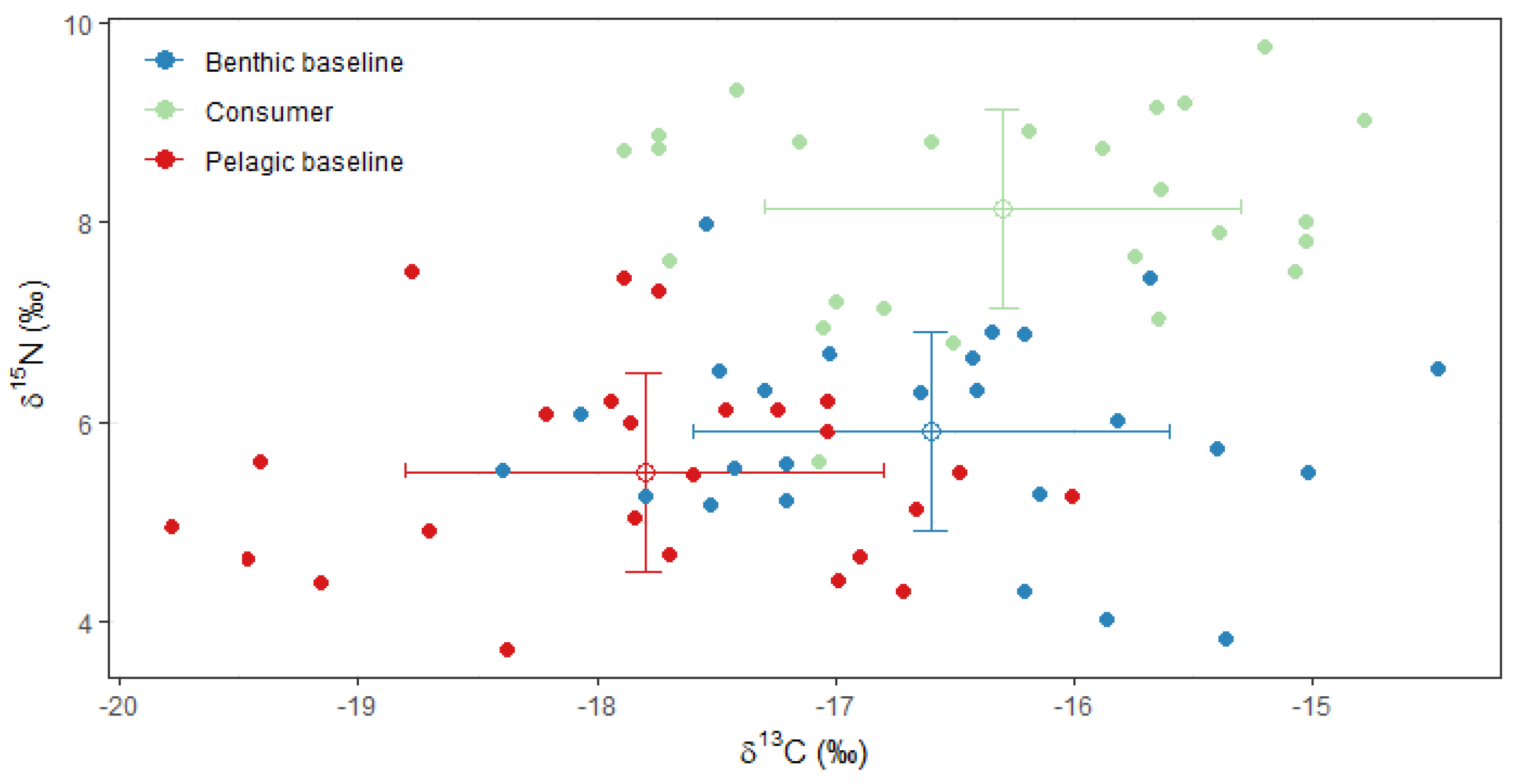 - Fry, B. Food web structure on Georges Bank from stable C, N, and S isotopic compositions. Limnol. Oceanogr. 1988, 33, 1182–1190. [Google Scholar] [CrossRef]