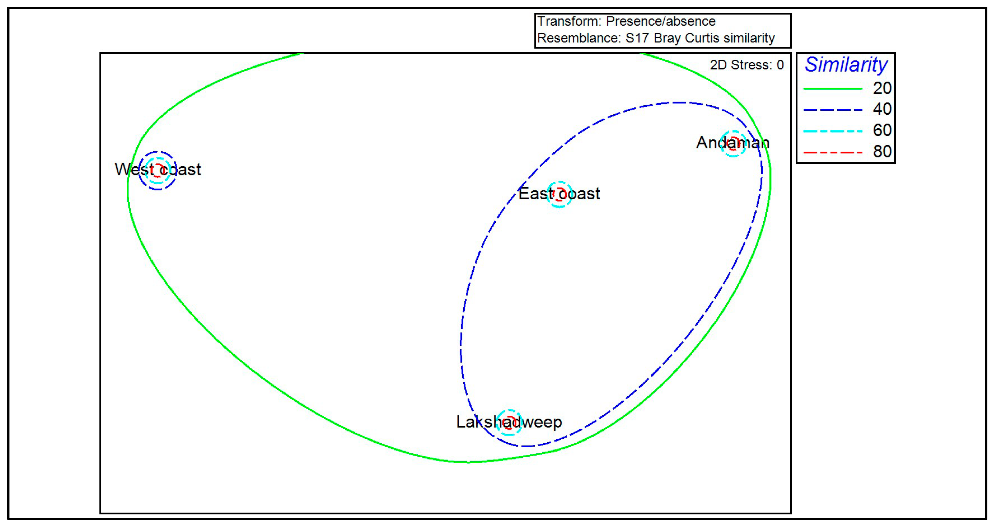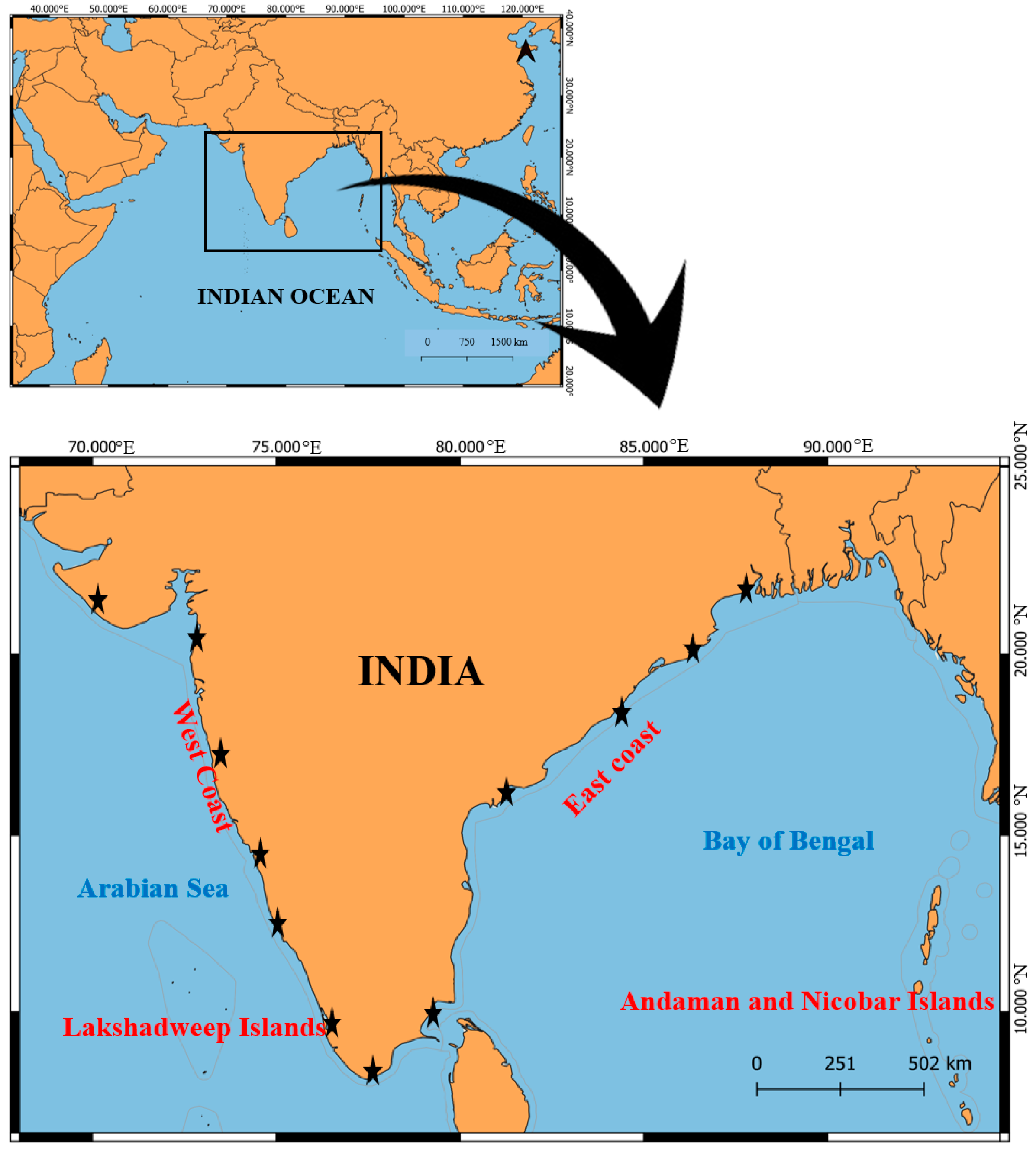 - Vinithkumar, N.V.; Sathish, T.; Das, A.K.; Sivaperuman, C.; Raghunathan, C.; Dharani, G.; Kirubagaran, R.; Sujathkumar, N.V. Marine ecosystems of Andaman and Nicobar Islands—Species abundance and distribution. In Biodiversity and Climate Change Adaptation in Tropical Islands; Academic Press: Cambridge, MA, USA, 2018; pp. 217–256. [Google Scholar]