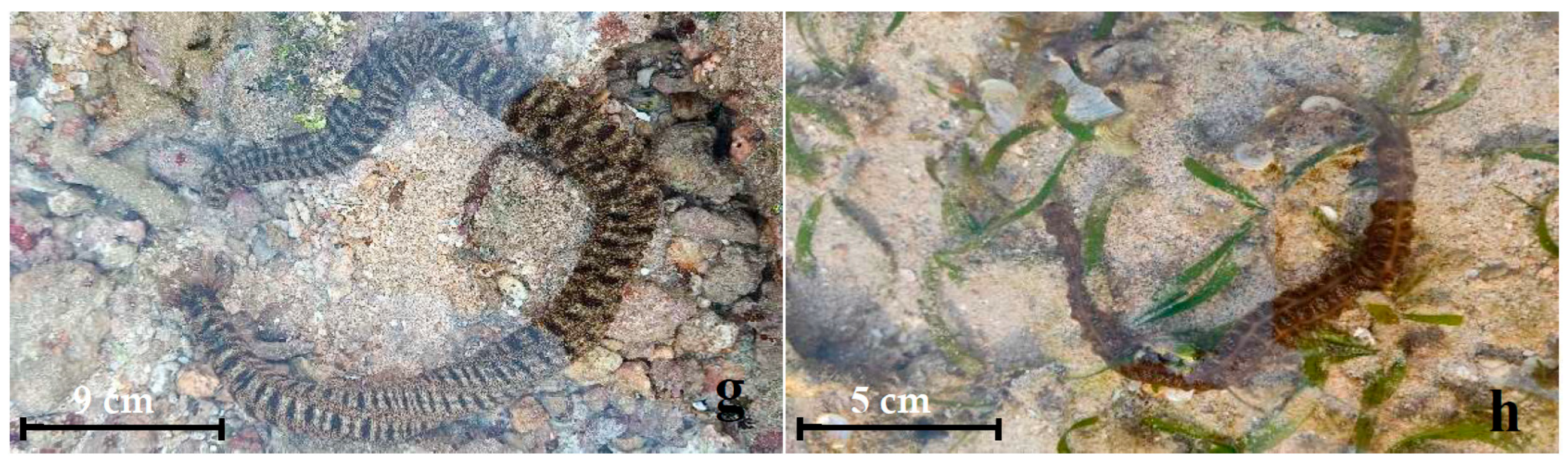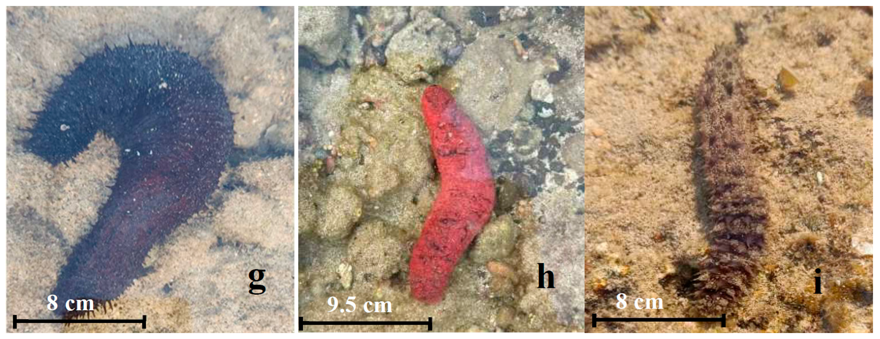 - Asha, P.S.; Diwakar, K.; Santhanavalli, G.; Manisseri, M.K. Comparative distribution and habitat preference of the sea cucumber Holothuria atra Jaeger at protected and unprotected sites in Thoothukudi region of Gulf of Mannar, south-east coast of India. Indian J. Fish. 2015, 62, 52–57. [Google Scholar]