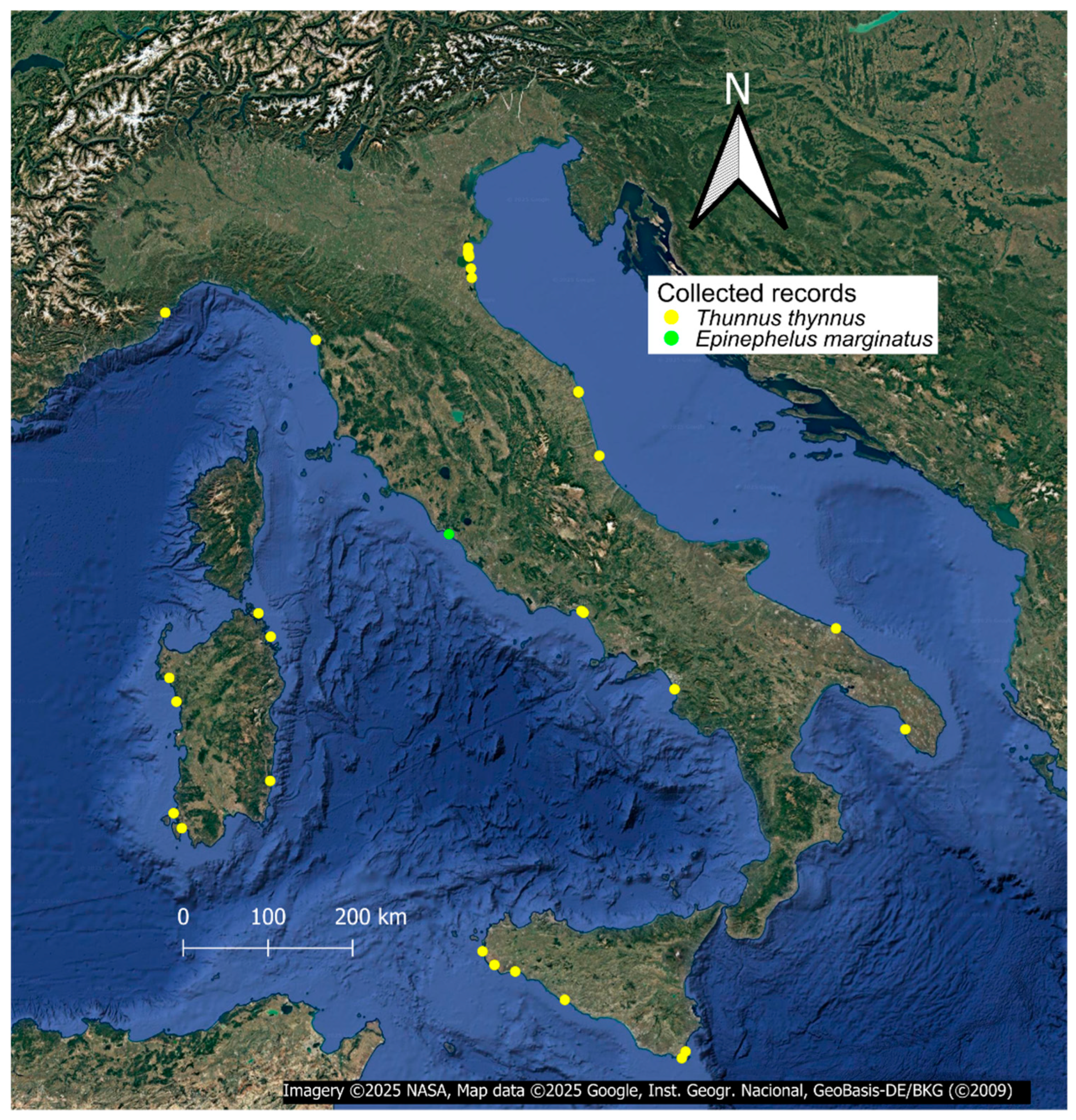 - Ministero dell’Agricoltura, della Sovranità Alimentare e delle Foreste. Campagna Di Pesca Del Tonno Rosso, Anno 2025—Esaurimento Del Contingente Assegnatoalla Pesca Sportiva/Ricreativa (SPOR). 2025. Available online: https://www.guardiacostiera.gov.it/portale/documents/116383/215063/Campagna+di+pesca+del+tonno+rosso%2C+anno+2025+-+Esaurimento+del+contingente+assegnato.pdf/0feb82eb-b0f5-e3e8-4944-85f7e9908b47?version=1.0&t=1755000440557null (accessed on 26 December 2025).