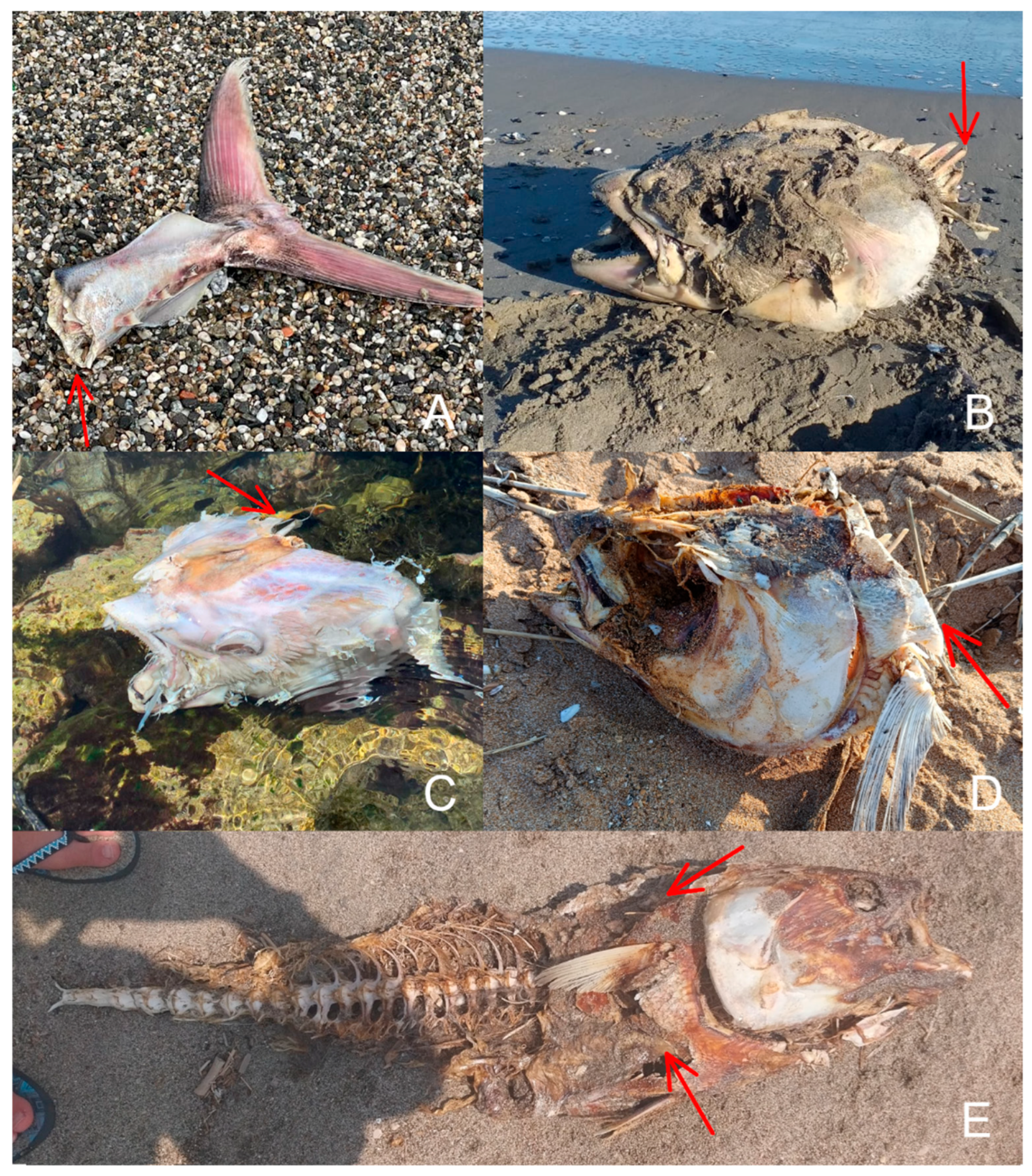 - Tiralongo, F.; Crocetta, F.; Riginella, E.; Lillo, A.O.; Tondo, E.; Macali, A.; Mancini, E.; Russo, F.; Coco, S.; Paolillo, G.; et al. Snapshot of Rare, Exotic and Overlooked Fish Species in the Italian Seas: A Citizen Science Survey. J. Sea Res. 2020, 164, 101930. [Google Scholar] [CrossRef]