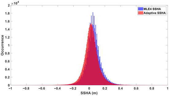 Histogram of SSHA Distribution for Cycle #501 (Blue: MLE4, Red: Adaptive; Data Edited, Open Ocean Data Retained).