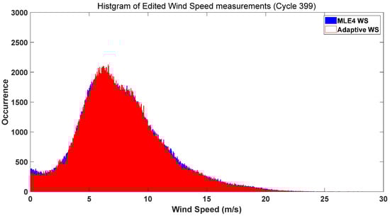 Histogram of WS Distribution for Cycle #399 (Blue: MLE4, Red: Adaptive Method; Data Unedited).