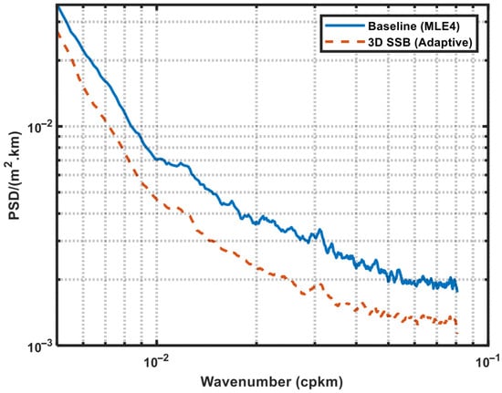 SSHA spectrums from Jason-3 satellite altimeter (Cycle #501–#506, GDR-G). The blue curve was for the Baseline (MLE4) SSHA, and the red curve was for the most precise 3D SSB (Adaptive) SSHA.
