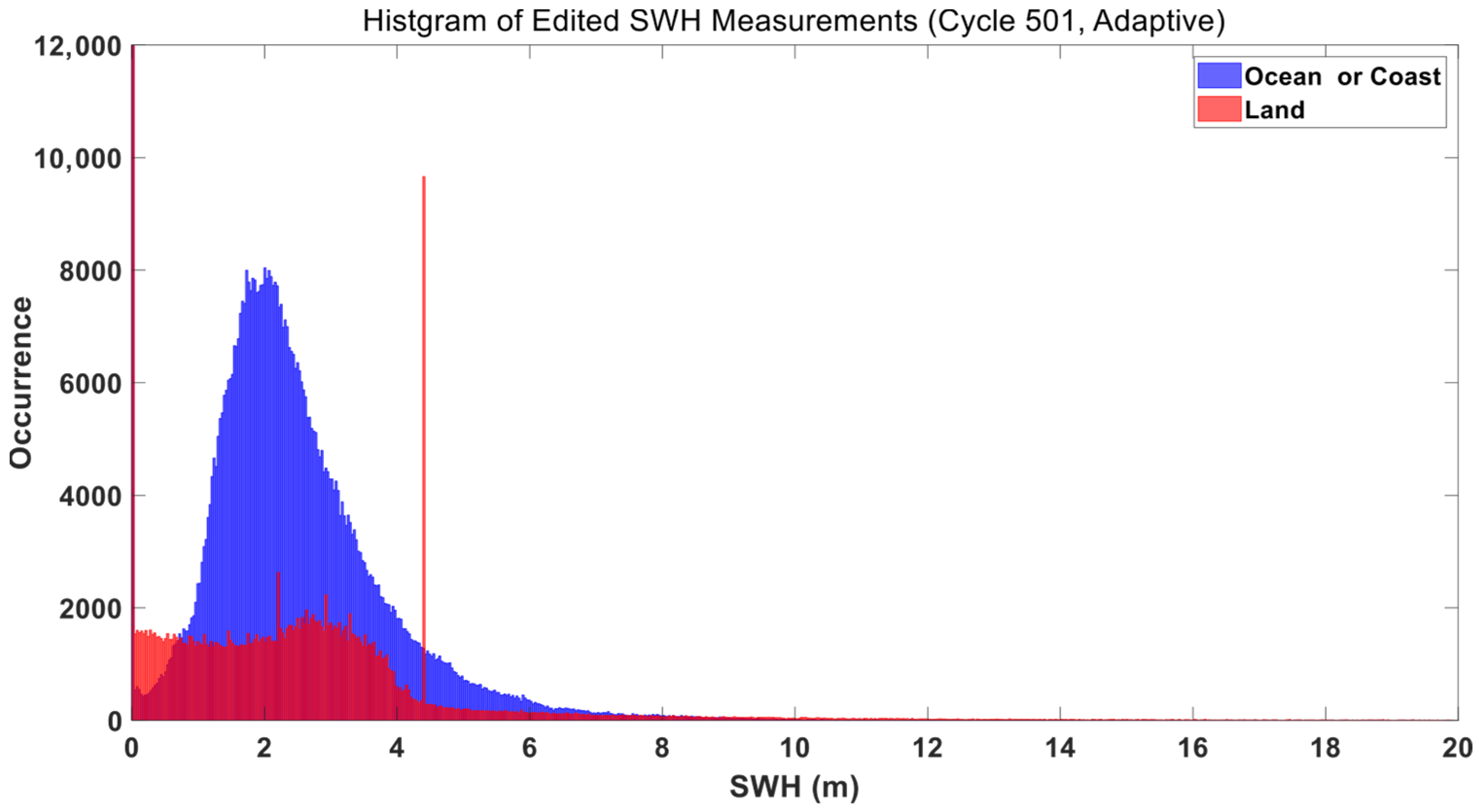 Histogram of SWH Distribution for Cycle #501 (Blue: Ocean or Coast, Red: Land).