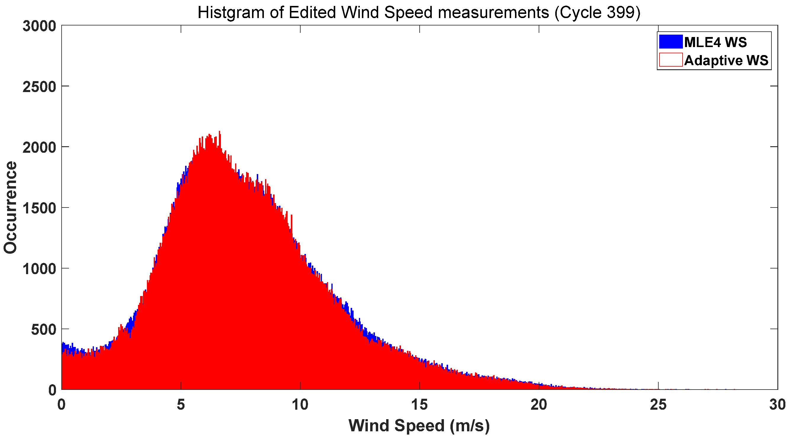 Histogram of WS Distribution for Cycle #399 (Blue: MLE4, Red: Adaptive Method; Data Edited, Open Ocean Data Retained).