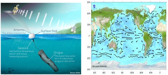 (Left): Components and function of a Global Drifter Program buoy, (Right): Major surface ocean currents across the globe.