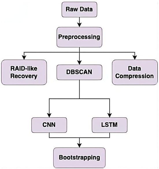 Data collection and preprocessing are the first step. These cleaned data are fed into DBSCAN for pseudo-labeling. The data, along with its pseudo-labels, is then used to train and test two models: a CNN and an LSTM. The results of the two models are compared using bootstrapping. The preprocessed data are additionally used to simulate a data loss scenario, with RAID to recover it. The data also undergoes compression for sustainability.