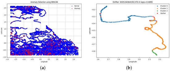 In Figure 4a, the trajectories of individual drifters are represented through a series of blue points, forming continuous and connected curves. These lines trace the movement of the drifter over the time period, showing the underlying structure of the data, and they also show that the proposed per-drifter approach is effective. It captures these individual movement patterns rather than mixing up multiple drifters’ behaviors. So, DBSCAN can more accurately identify anomalous points.